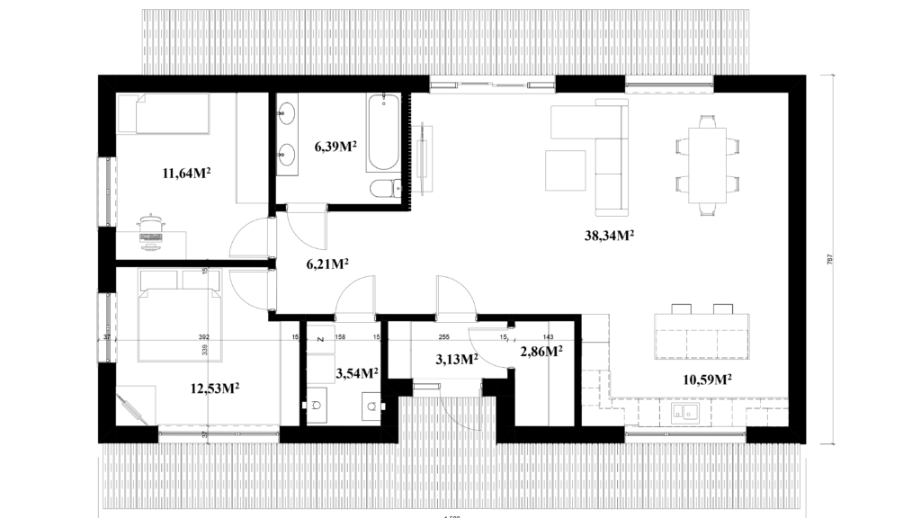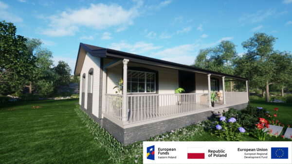 - Außenschreinerei – Dreischeibenfenster (einseitige Farbe) und Außentüren