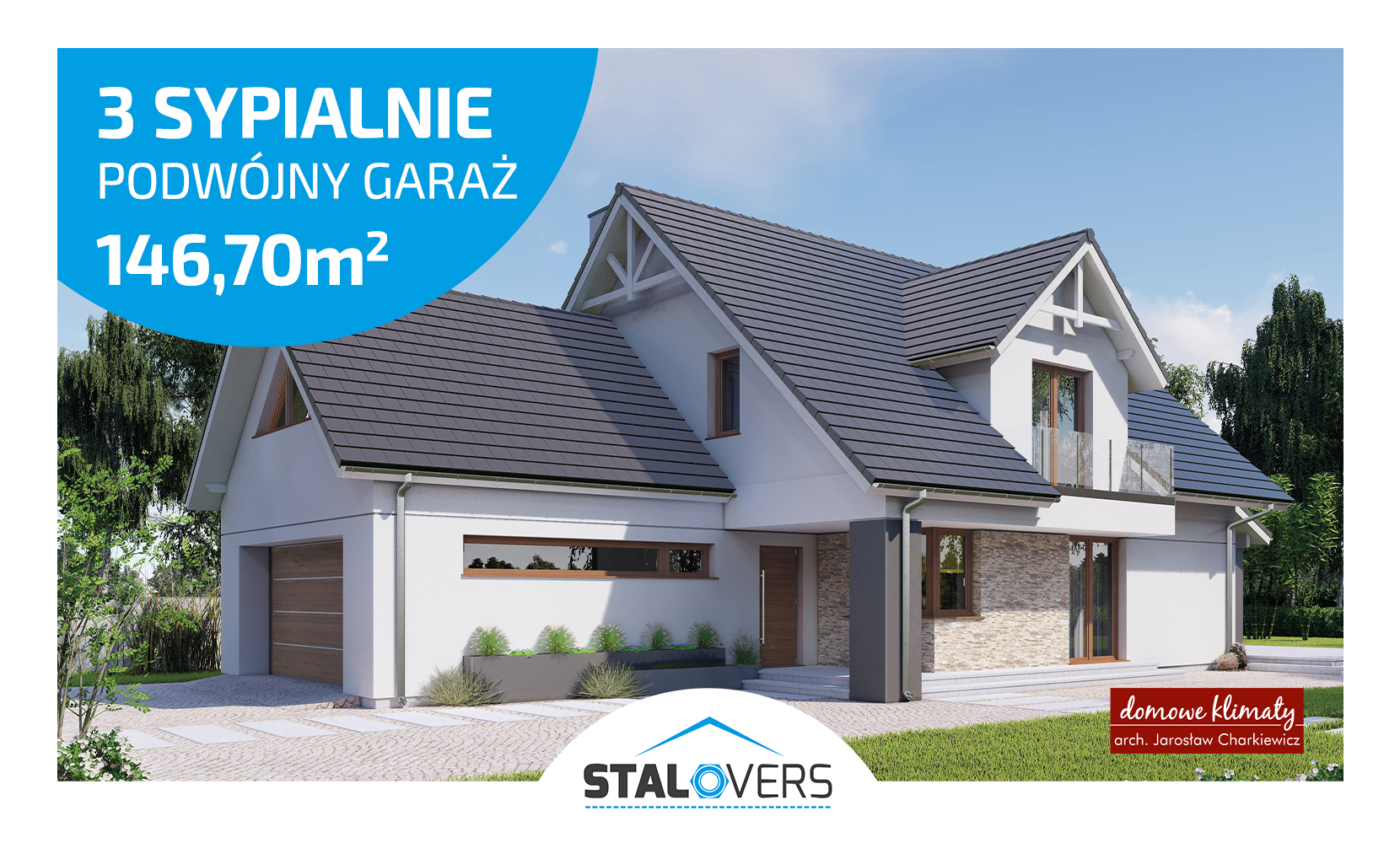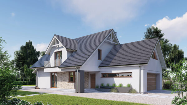 Projekt domu z użytkowym poddaszem i dwustanowiskowym garażem.