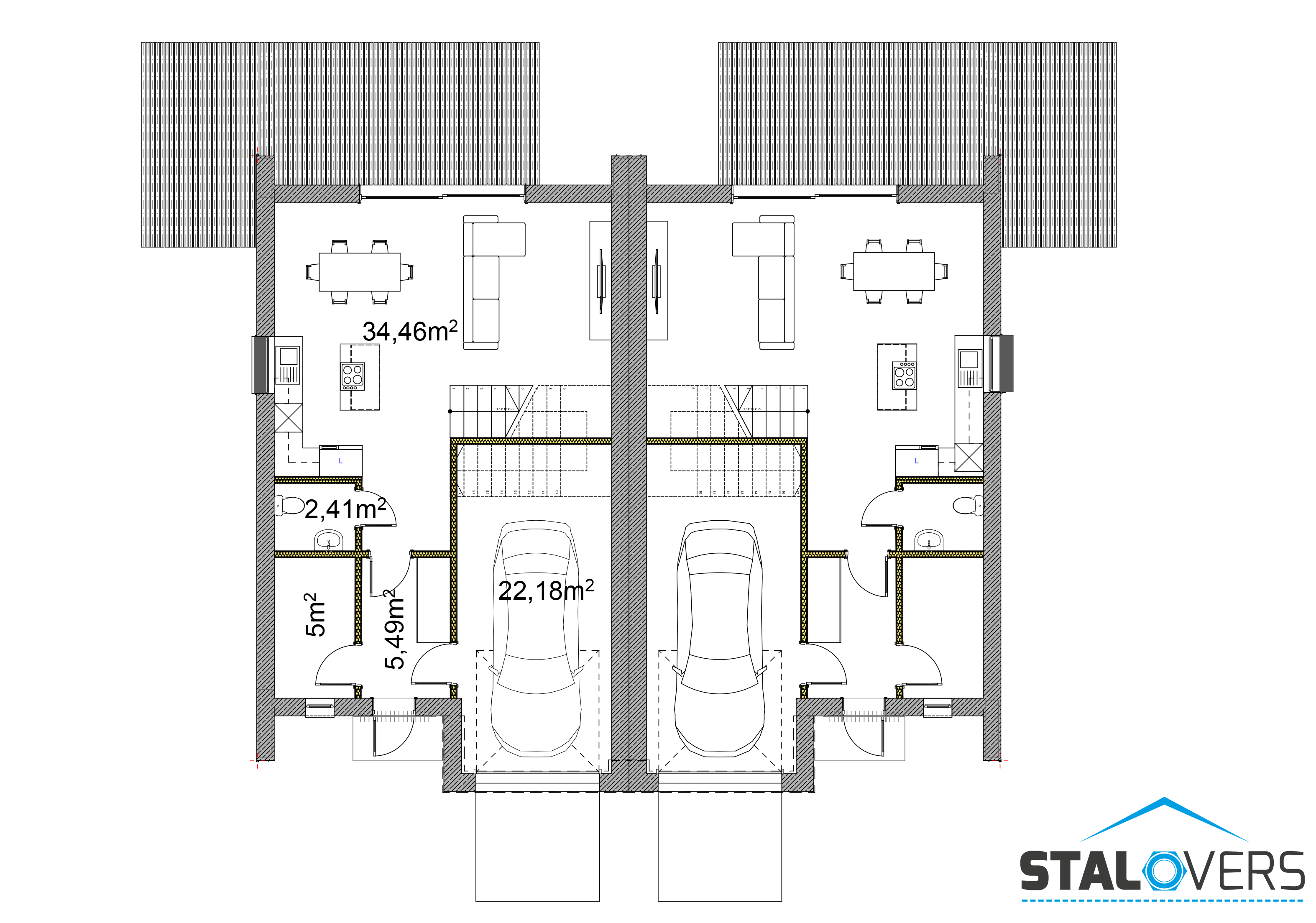 W projekcie przewidziano również jednostanowiskowy garaż, który subtelnie wkomponowano w bryłę budynku, nie zaburzając jego spójnej, nowoczesnej linii. Idealna propozycja dla osób poszukujących funkcjonalnego i estetycznego domu bliźniaczego o ponadczasowym charakterze.